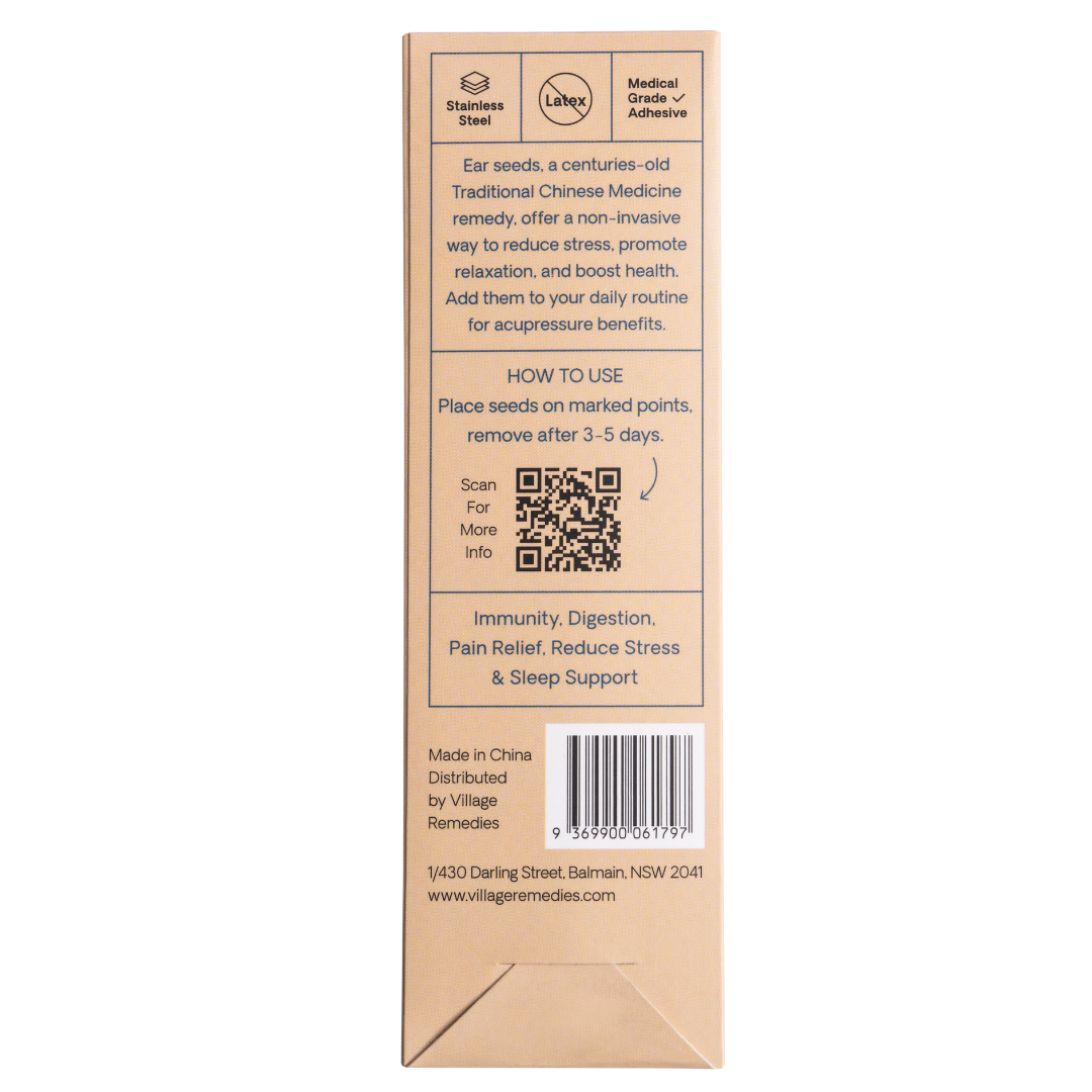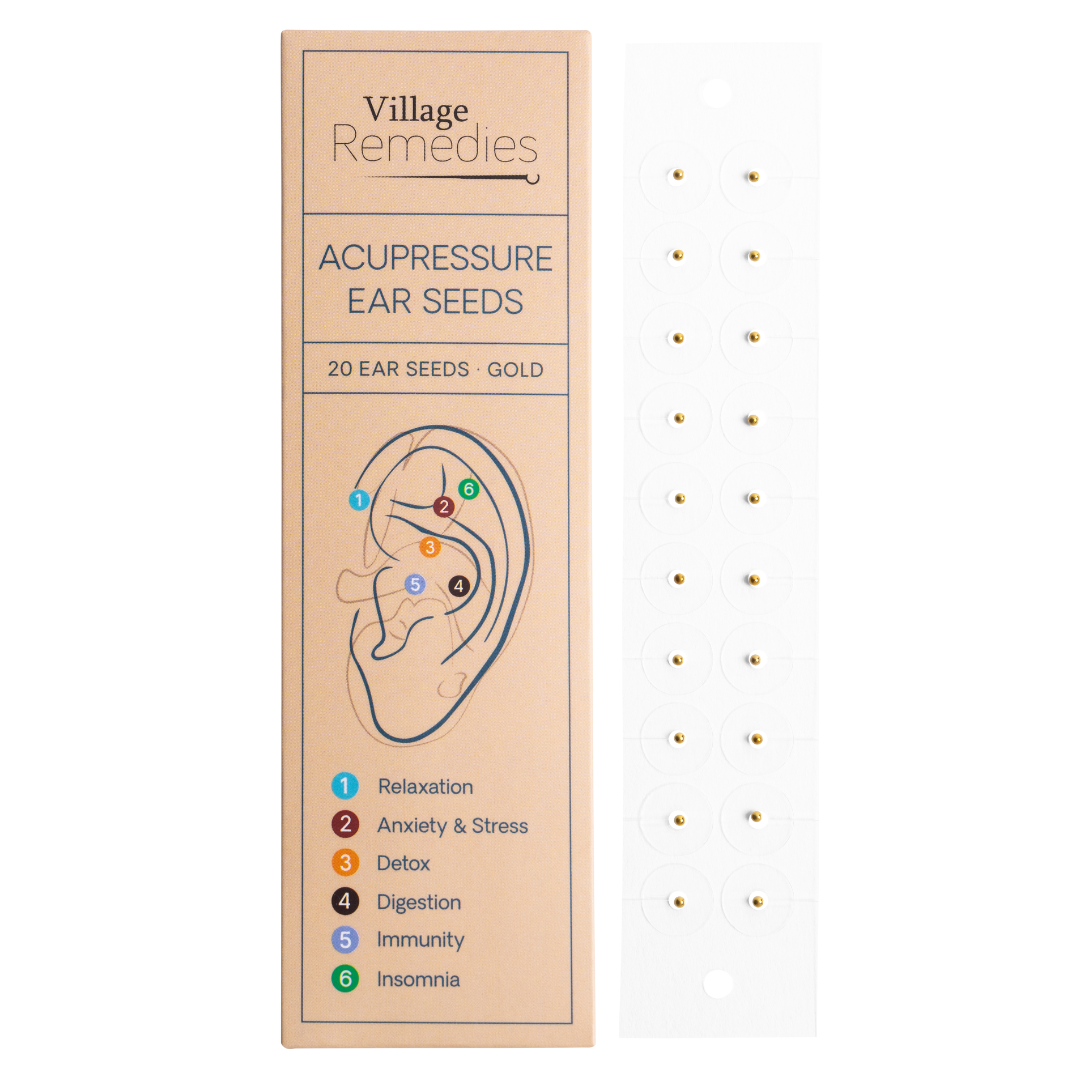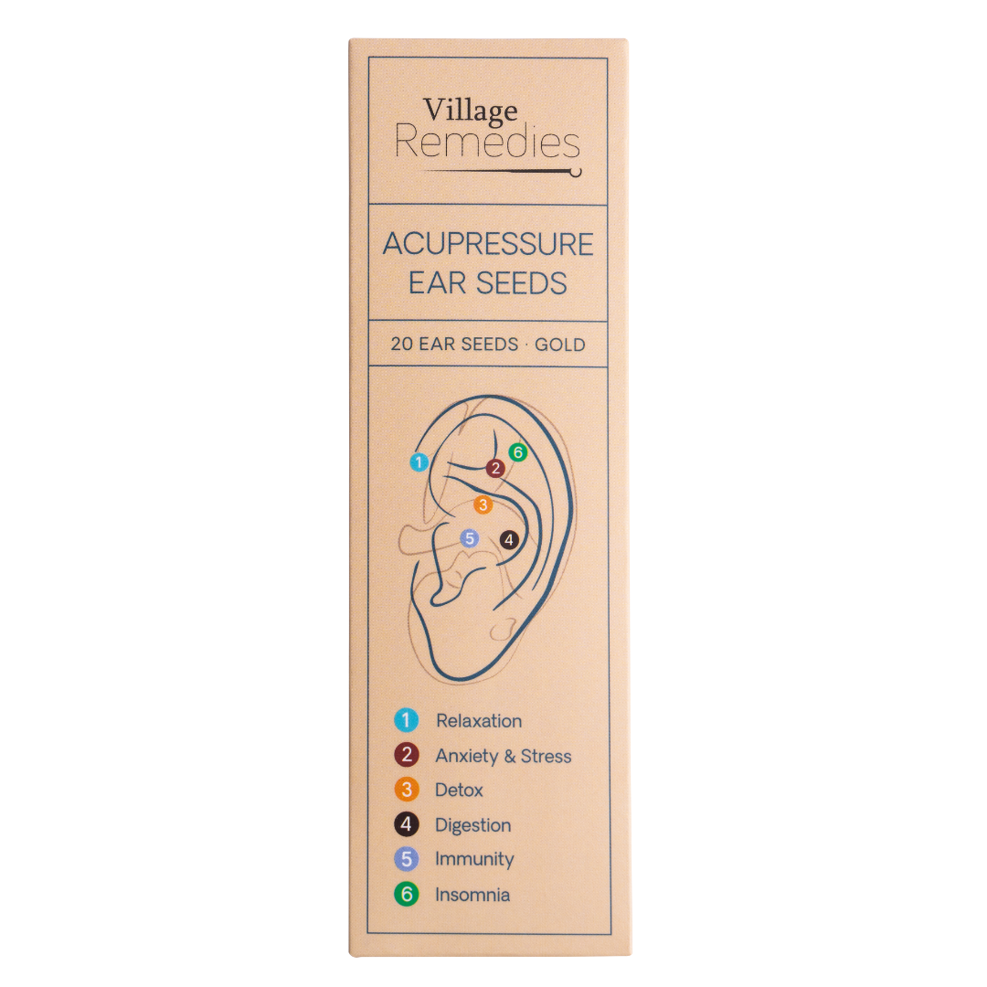 Our Village Remedies Ear Seeds are sleek, gold-colored steel beads attached to medical-grade adhesive strips. Designed for auriculotherapy—a form of ear-focused acupressure—each pack contains 20 seeds. These seeds are strategically placed on your ear to target specific body areas, promoting better health and wellness.